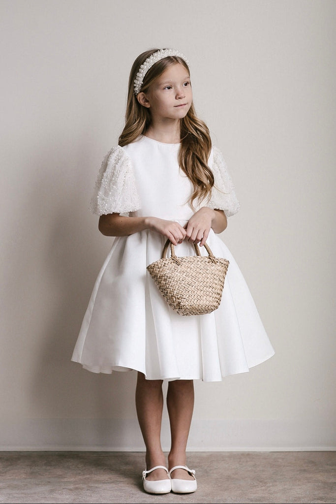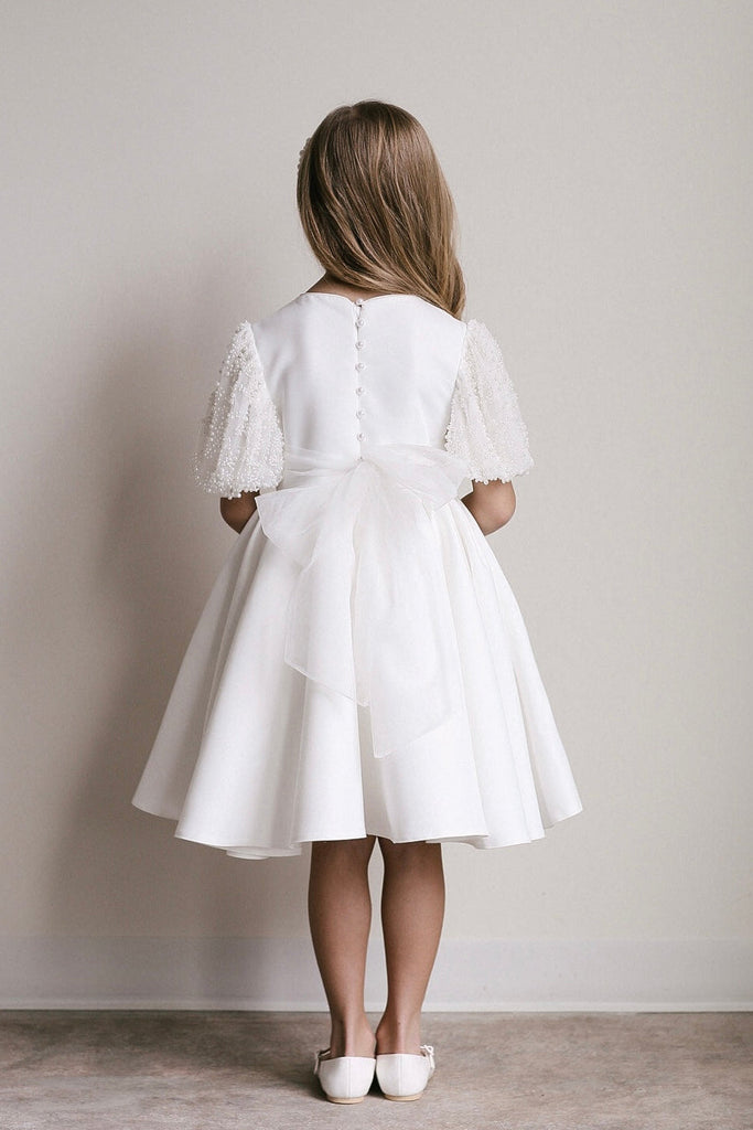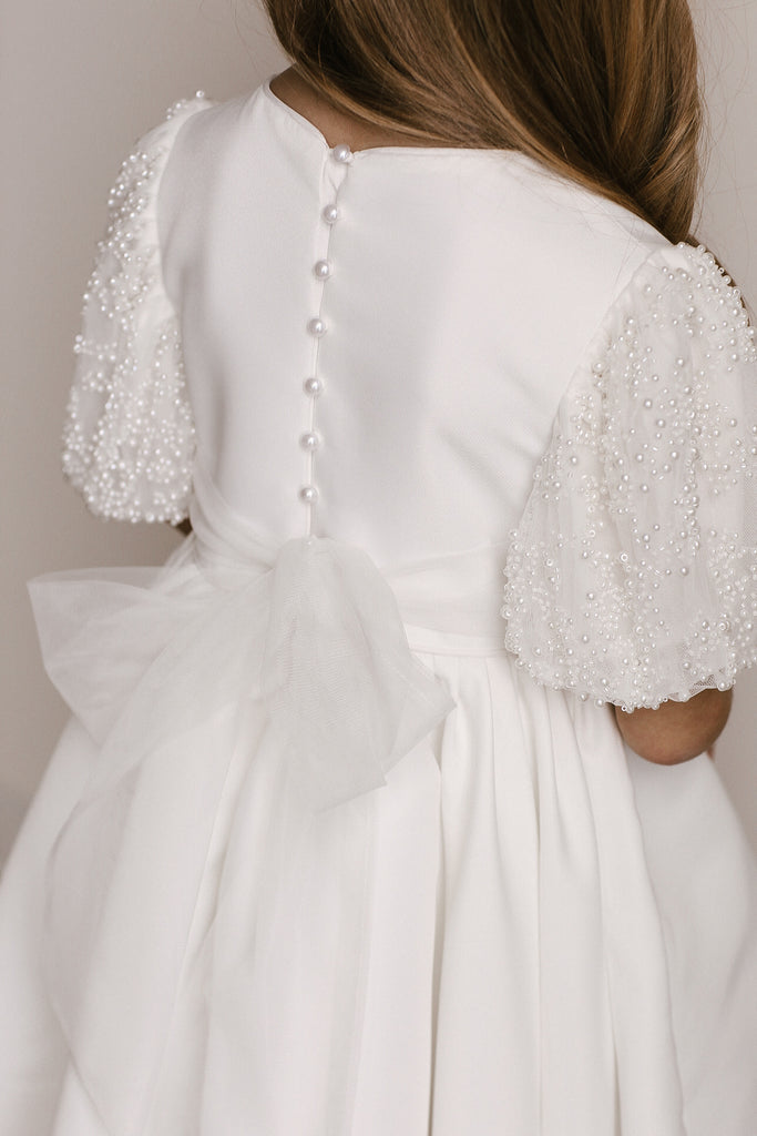 This dress features a pearl puff shoulder bodice, giving it a stylish look. The bow and the pearl buttons on the back add a touch of charm and sophistication. Additionally, the flow skirt ensures comfort and ease of movement, making it perfect for twirling and dancing.